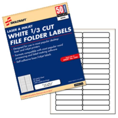 White, .67'' x 3.4375'' rectangle 1/3 cut file folder laser labels for sharper print, 30 labels per 8.5'' x 11'' sheet and 50 sheets per box. Packed 18 boxes per case. This item is available under the office supplies contract.