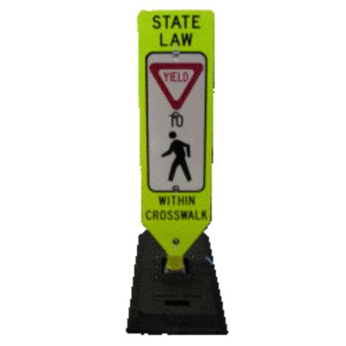 Yield to Pedestrian Channelizing Device, R1-6 sign, 47" high x 12" wide, double yield sign with 14" x 34" rubber base. Fluorescent yellow green diamond grade sheeting.This is a "special order product" and not eligible for return.