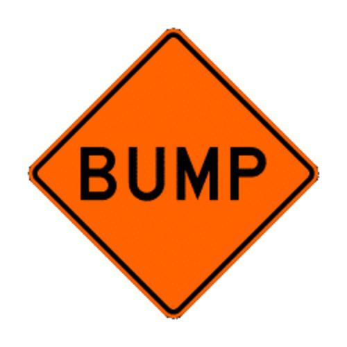Bump Flexible roll-up signs are made of Type VI microprism retro reflective SUPERBRITE sheeting heat sealed to a heavy duty vinyl coated fabric. Legend and border are silk screened with black ink. Reinforced fiberglass cross brace ribs with flag holder provide a light-weight, rugged, easy to set up and take down temporary traffic sign. Excellent daytime visibility, plus the brightest night time retro reflectivity available. Meets FHWA requirements for NCHRP350 FHWA Acceptance WZ-18. Requires 3 special safety warning flags with detent button. Black and white legends do not require safety warning flags. Signs, stand and flags sold separately. W8-1