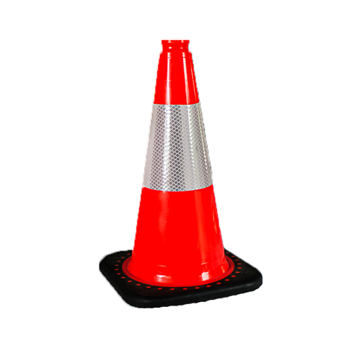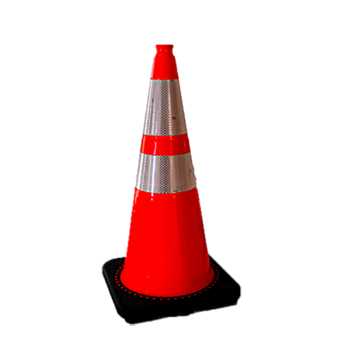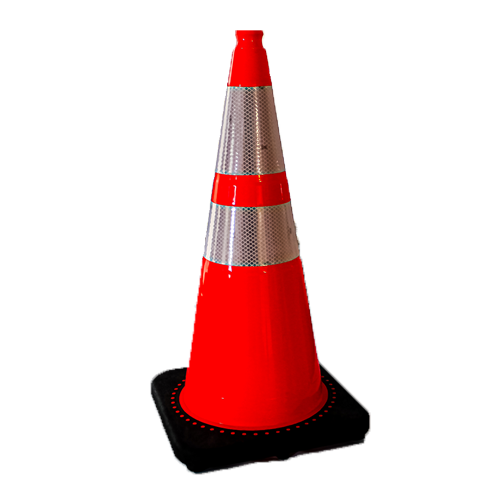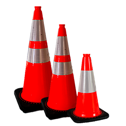 Orange Safety Cones with 4 and 6 reflective tape. 18" Cone has a 10" Square Base, weight 3lbs.; 28" Cone has a 15" Square Base, weight 10lbs.; 36" Cone has a 15" Square Base, weight 10lbs.