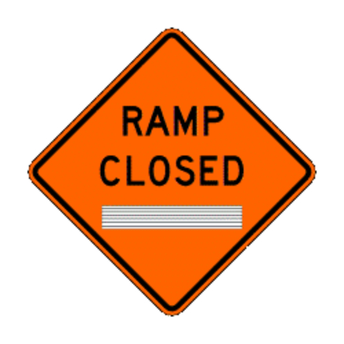 Ramp Closed Flexible roll-up signs are made of Type VI microprism retro reflective SUPERBRITE sheeting heat sealed to a heavy-duty vinyl coated fabric. Legend and border are silk screened with black ink. Reinforced fiberglass cross brace ribs with flag holder provide a lightweight, rugged, easy to set up and take down temporary traffic sign. Excellent daytime visibility, plus the brightest nighttime retro reflectivity available. Meets FHWA requirements for NCHRP350 FHWA Acceptance WZ-18. Requires 3 special safety warning flags with detent button. Black and white legends do not require safety warning flags. Signs, stand, and flags sold separately. W20-3