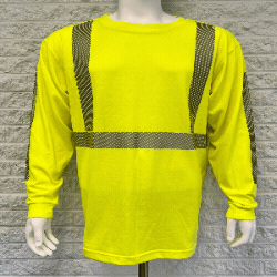 Safety T-Shirt - Long Sleeve, Yellow-Green, 50/50 Cotton/Poly Blend, Crew Neck, 2" Segmented Reflective Striping. ANSI/ISEA Compliant, Class 2, Type R (Not FR)
